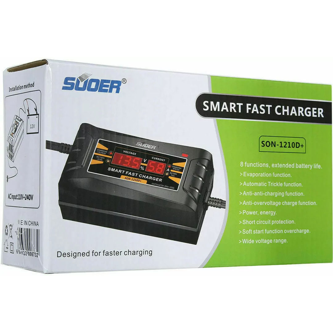 SUOER SON-1206D. Διαθέτει έναν ελεγκτή MCU για να διαχειριστεί τη διαδικασία της φόρτισης της μπαταρίας. Το ρεύμα θα σταματήσει αυτόματα να φορτίζει όταν η μπαταρία φορτιστεί πλήρως.